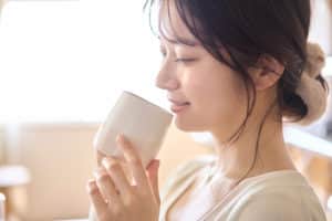 カップを手に持ち飲み物を飲む若い女性。